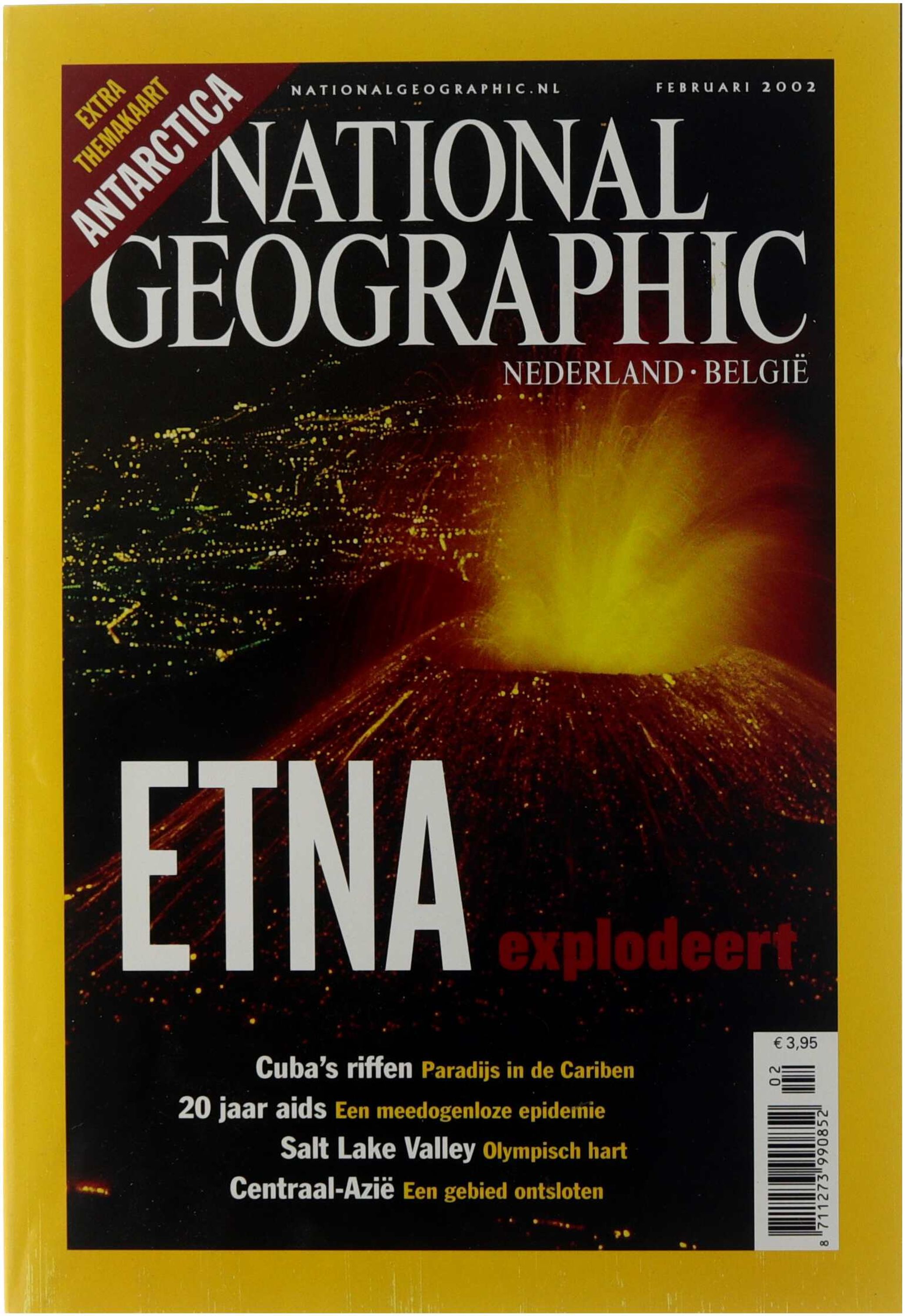 Deze editie van National Geographic Nederland • België uit februari 2002 biedt een diepgaande journalistieke blik op diverse natuurverschijnselen en sociaal-maatschappelijke thema's die rond de millenniumwisseling actueel waren. Het hoofdartikel focust op de spectaculaire en verwoestende uitbarstingen van de vulkaan Etna op Sicilië, ondersteund door indrukwekkende fotografie van de lavastromen. Daarnaast besteedt het tijdschrift aandacht aan de kwetsbare koraalriffen van Cuba en de twintigste verjaardag van de aids-epidemie, een terugblik op de impact van deze genadeloze ziekte. De sportwereld komt aan bod met een reportage over de Salt Lake Valley als het hart van de Olympische Winterspelen van 2002, terwijl een geografische verkenning van Centraal-Azië de politieke en landschappelijke ontsluiting van die regio belicht. Als extraatje bevat dit nummer een themakaart over Antarctica, wat de educatieve waarde van deze uitgave over de natuurlijke wereld en menselijke geschiedenis onderstreept.
