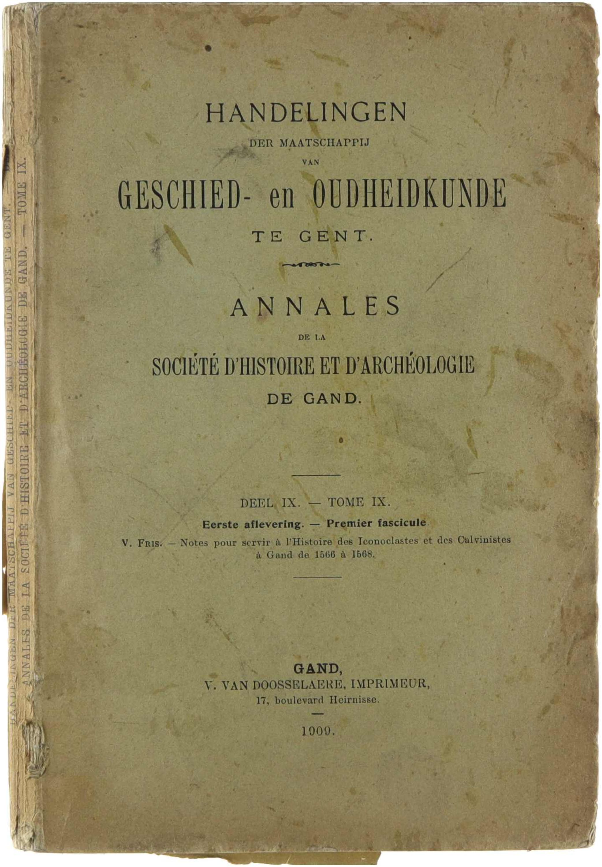 Deze eerste aflevering van deel IX van de Handelingen der Maatschappij van Geschied- en Oudheidkunde te Gent bevat de studie Notes pour servir à l’histoire des Iconoclastes et des Calvinistes à Gand de 1566 à 1568. In deze bijdrage onderzoekt V. Fris de gebeurtenissen rond de Beeldenstorm en de calvinistische periode in Gent, met bijzondere aandacht voor politieke ontwikkelingen, religieuze spanningen en stedelijke machtsverhoudingen. De auteur baseert zich op archiefbronnen en eigentijdse documenten en levert zo een gedetailleerde reconstructie van deze woelige jaren in de Gentse geschiedenis.