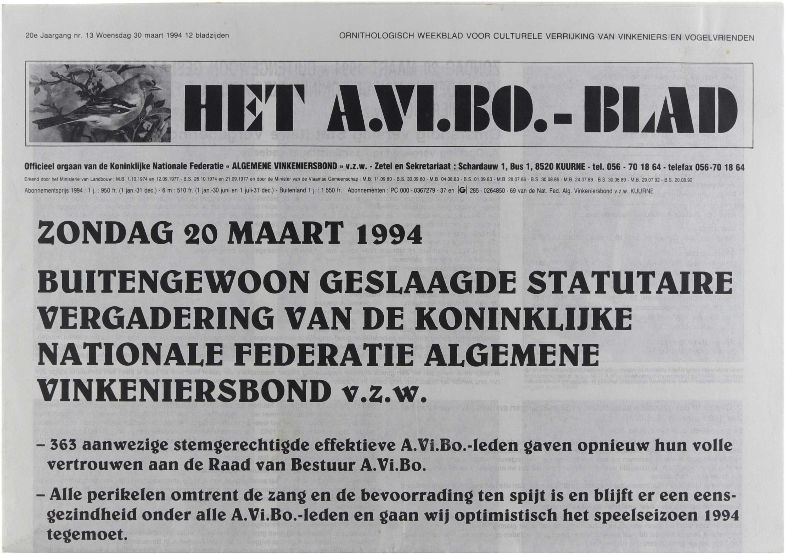 Ornithologisch weekblad voor culturele verrijking van vinkeniers en vogelvrienden 30 maart 1994