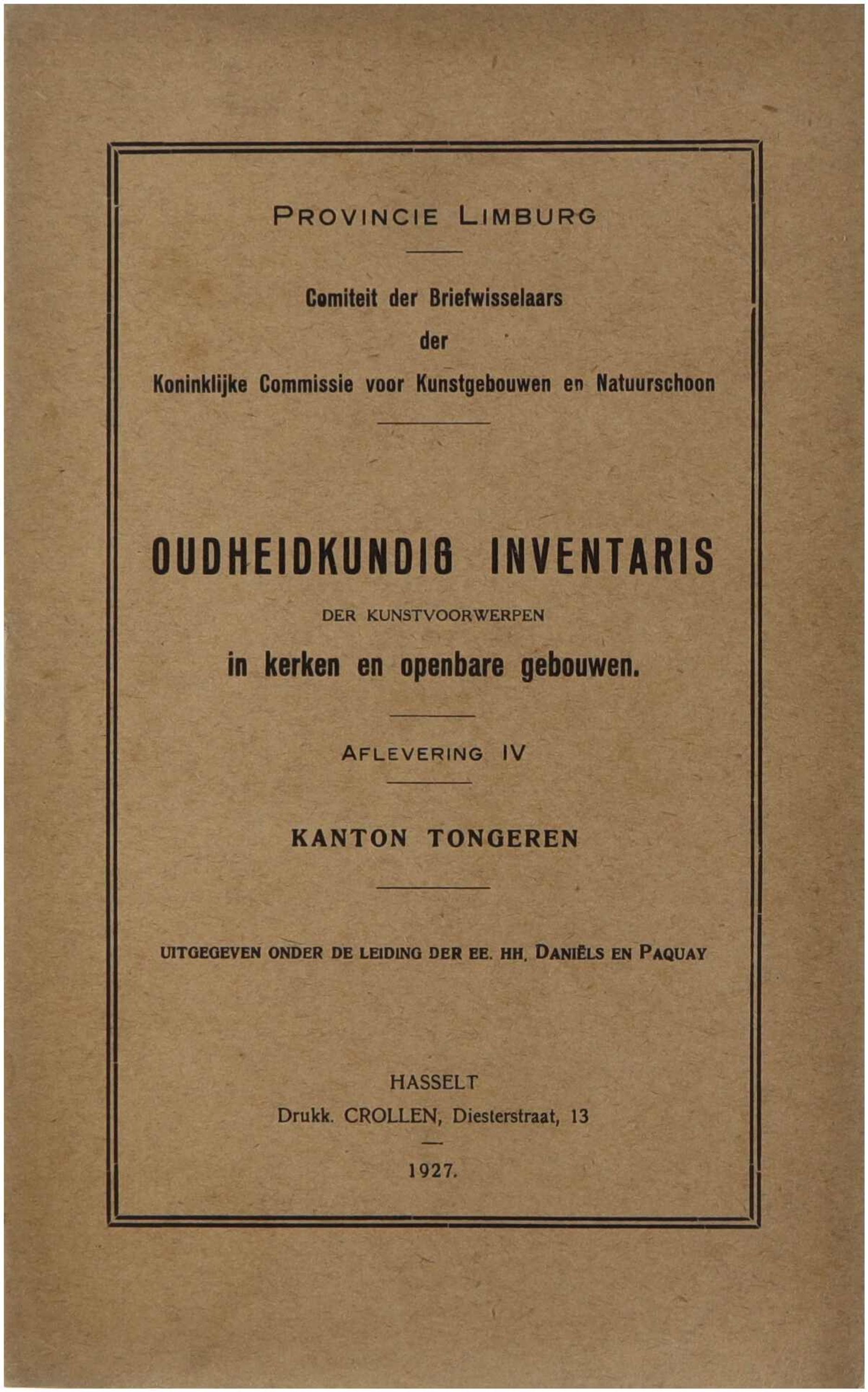 Oudheidkundig Inventaris der kunstvoorwerpen in kerken en openbare gebouwen. Aflevering IV : Kanton Tongeren
