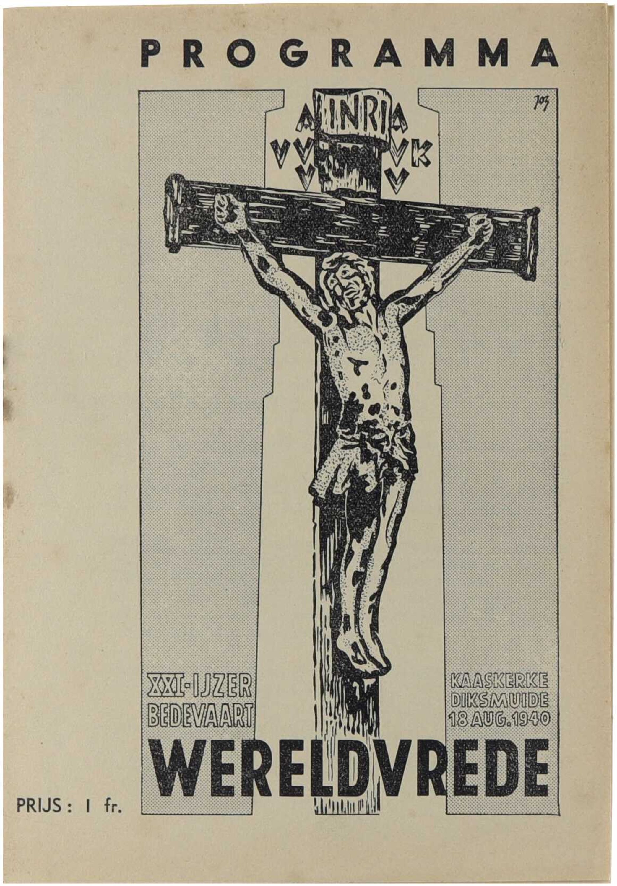 Dit programmaboekje werd uitgegeven ter gelegenheid van de eenentwintigste IJzerbedevaart, gehouden op 18 augustus 1940 te Kaaskerke-Diksmuide, met als centraal thema “Wereldvrede”. De publicatie bevat het officiële verloop van de plechtigheden en weerspiegelt de blijvende herdenkingsfunctie van de IJzerbedevaart in een uitzonderlijke historische context, kort na het uitbreken van de Tweede Wereldoorlog. Het programma sluit aan bij de traditie van de jaarlijkse bedevaarten naar “Vlaanderens doodenveld” en benadrukt de symboliek van vrede, herinnering en collectieve rouw.