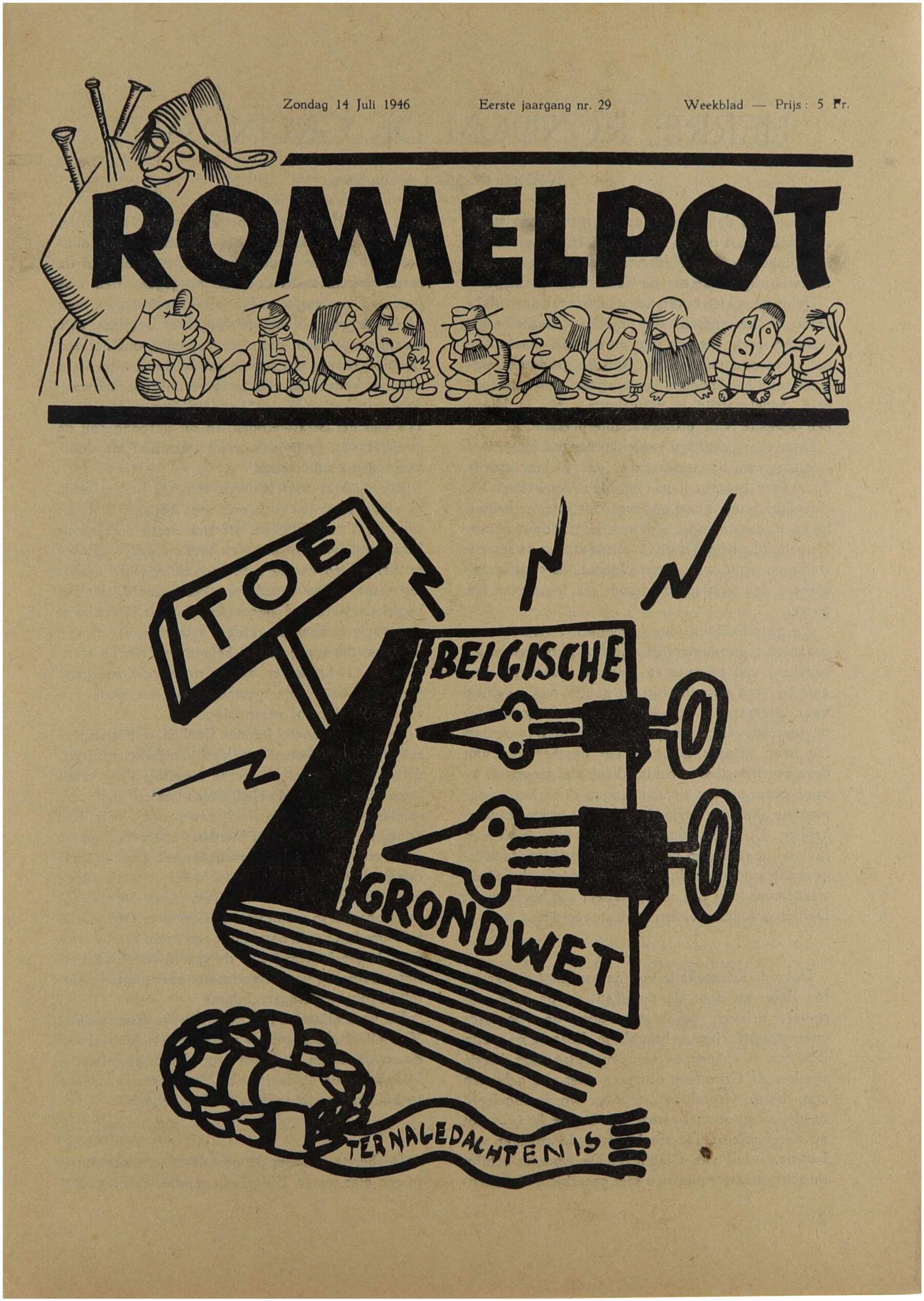 Dit losse nummer van de eerste jaargang van Rommelpot illustreert het karakter van het blad als Nederlandstalig satirisch en polemisch weekblad in het naoorlogse België. Het combineert humoristische stukken, cartoons, korte verhalen en opiniërende bijdragen met scherpe kritiek op het repressiebeleid na de Tweede Wereldoorlog. Het tijdschrift nam een uitgesproken Vlaams-nationalistische en anti-repressiepositie in en werd omwille van zijn confronterende toon als controversieel beschouwd. Elk afzonderlijk nummer weerspiegelt de politieke en ideologische spanningen die het publieke debat in het naoorlogse Vlaanderen kenmerkten.