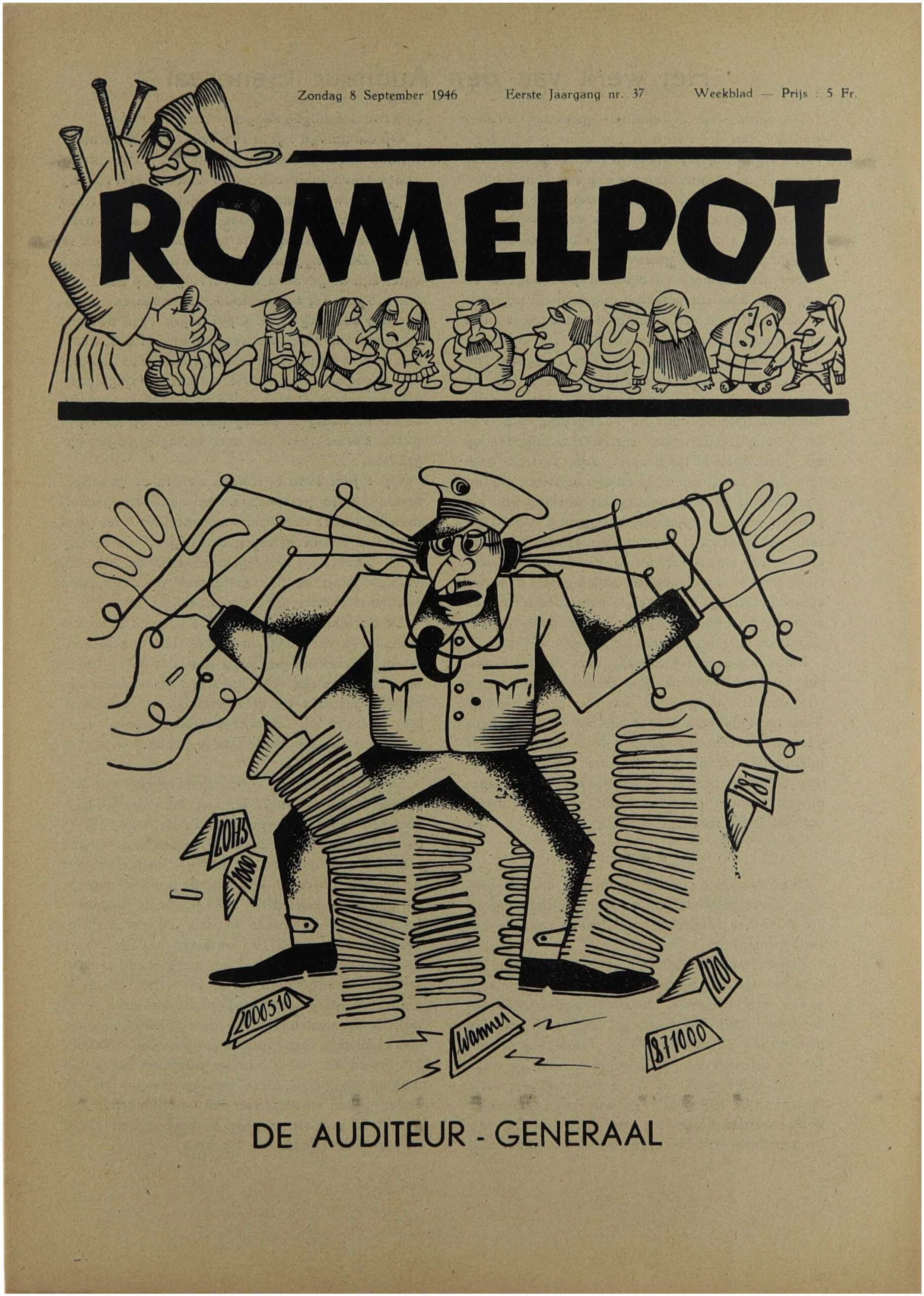Dit losse nummer van de eerste jaargang van Rommelpot illustreert het karakter van het blad als Nederlandstalig satirisch en polemisch weekblad in het naoorlogse België. Het combineert humoristische stukken, cartoons, korte verhalen en opiniërende bijdragen met scherpe kritiek op het repressiebeleid na de Tweede Wereldoorlog. Het tijdschrift nam een uitgesproken Vlaams-nationalistische en anti-repressiepositie in en werd omwille van zijn confronterende toon als controversieel beschouwd. Elk afzonderlijk nummer weerspiegelt de politieke en ideologische spanningen die het publieke debat in het naoorlogse Vlaanderen kenmerkten.