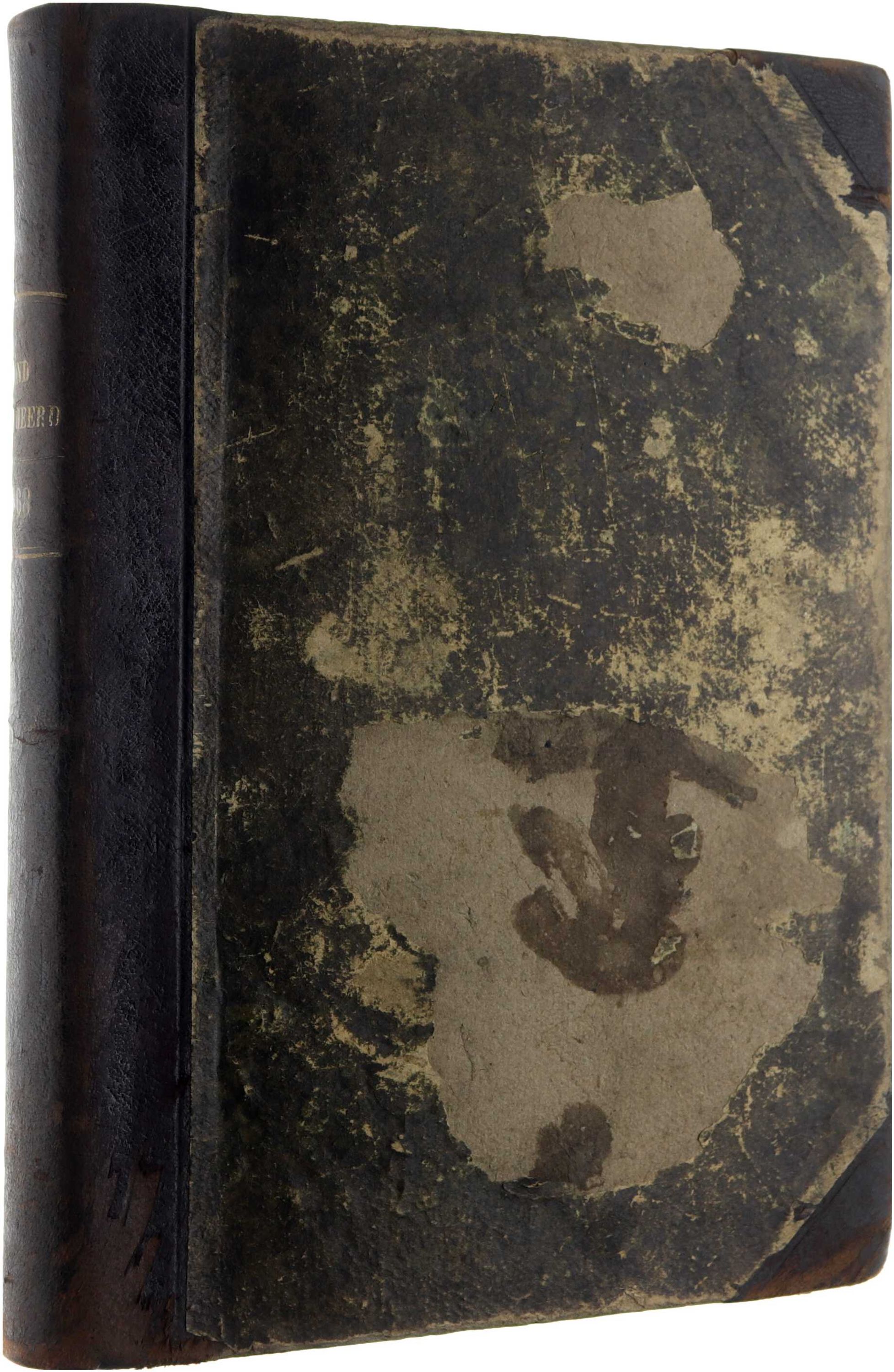 Verkleuring. Eigendomsmerk. Eigenaarsstempel; gescheurde bladen,-, geplakt, kleine stukken tekstverlies op hoeken; mooie lederen rug; 6 laatste bladzijden ontbreken
