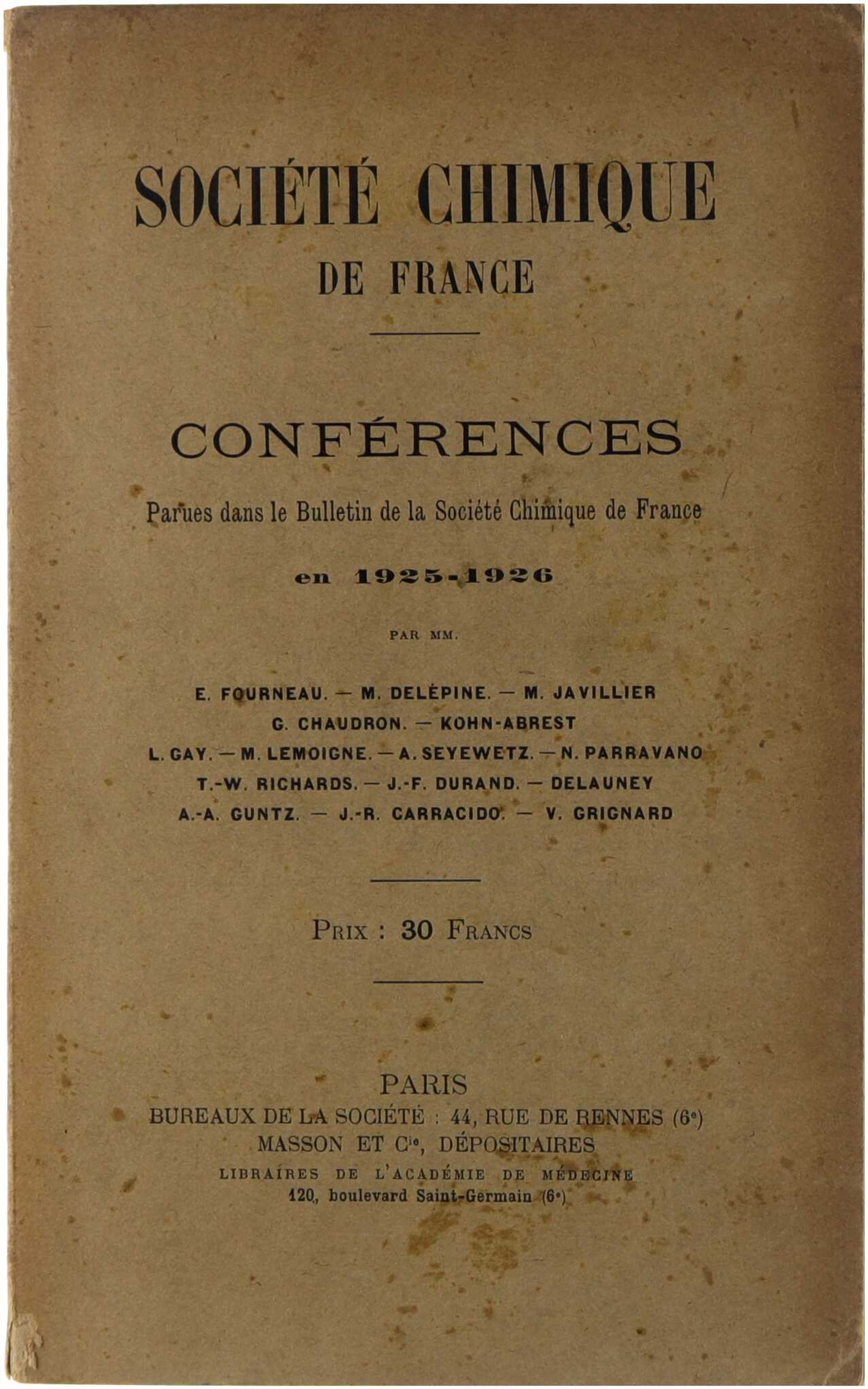 Société Chimique de France - Conférences parues dans le Bulletin de la Société Chimique de France en 1925-1926