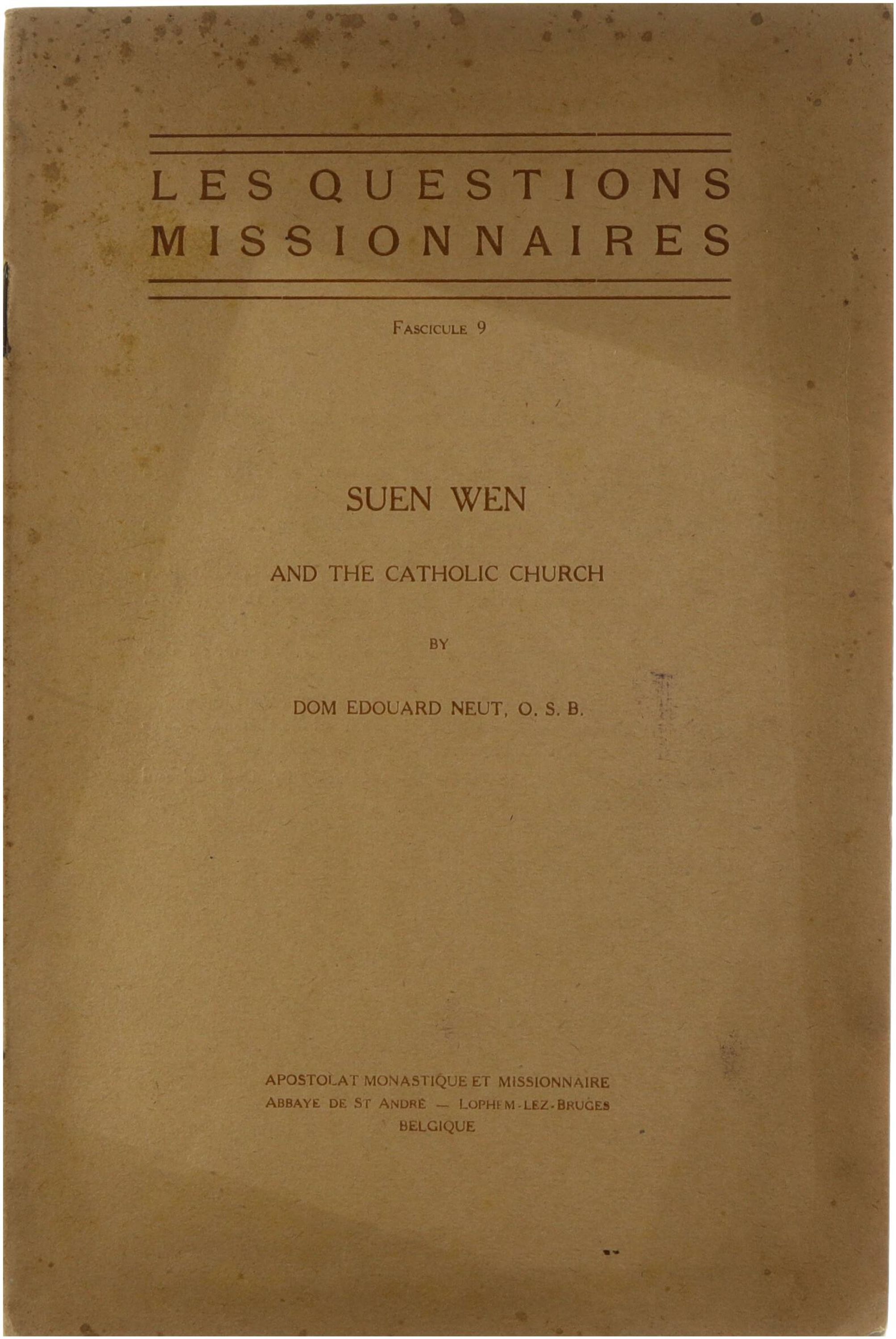 This study examines the relationship between Suen Wen (Sun Yat-sen) and the Catholic Church within the broader context of missionary activity in China. The author analyses Suen Wen’s religious background, his contacts with Christian communities, and the position of the Catholic Church in the political and cultural transformations of early twentieth-century China. The brochure situates these developments within the missionary concerns of the period and reflects contemporary Catholic perspectives on Chinese nationalism and reform.