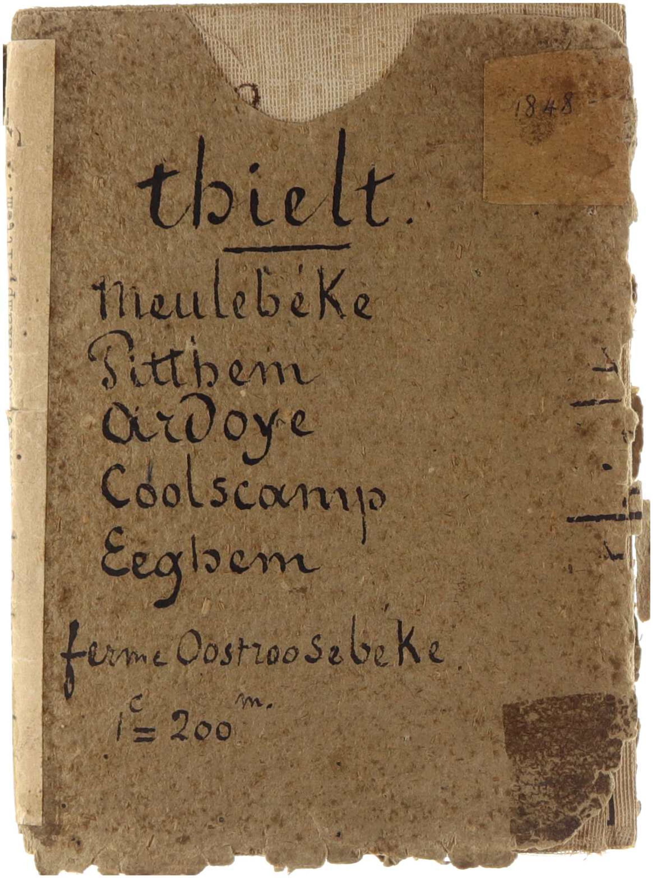 Papieren kaart, op linnen geplakt en met de hand ingekleurd, vermoedelijk uit het tweede kwart van de 19de eeuw. De kaart is volledig Nederlandstalig en toont in groot detail de streek van Thielt, Meulebeke, Pitthem, Ardoye, Coolscamp, Eeghem en (de) ferme Oostroosebeke op een schaal van 1 c = 200 m. Gebouwen zijn weergegeven als zwarte grondplannen; afzonderlijke locaties zoals Bosterhoutmolen, de nieuwe brug over de Mandel in Oostrozebeke en de ferme Oostroosebeke zijn expliciet benoemd. Bossen zijn aangeduid met reeksen kleine cirkeltjes, zonder legenda. De kaart heeft een rand met vermelding van omliggende gemeenten, wat erop wijst dat zij vermoedelijk deel uitmaakte van een ruimere regionale kaartreeks. De aanduiding “de nieuwe brug” is historisch relevant: op de Inventaris Onroerend Erfgoed wordt voor die locatie vermeld dat er omstreeks 1766 een nieuwe stenen brug over de Mandel zou zijn gebouwd en dat de Atlas der Buurtwegen van 1845 daar nog “Cabaret Le nouveau Pont” noteert; dat ondersteunt een vroege 19de-eeuwse datering, al blijft die zonder titel of uitgever voorlopig benaderend. Door de vorige eigenaar gedateerd op 1848.