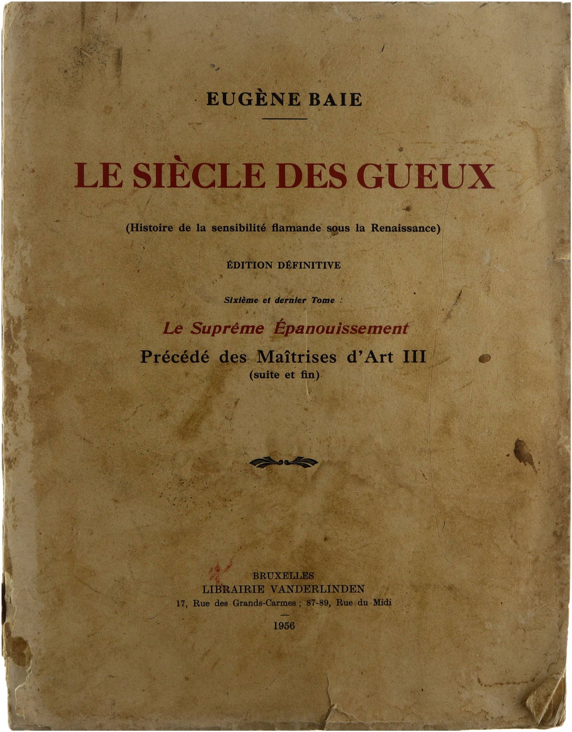 Dans ce sixième tome de Le siècle des gueux, Eugène Baie poursuit son étude de la sensibilité flamande à la Renaissance. Intitulé Le suprème épanouissement précédé des Maîtrises d'art III, l’ouvrage analyse l’aboutissement artistique et spirituel de la période des Gueux, en mettant l’accent sur les maîtrises d’art et l’évolution esthétique en Flandre. Il s’inscrit dans une vaste fresque historique consacrée aux mentalités, à la culture et aux expressions artistiques des Pays-Bas méridionaux au XVIᵉ siècle.