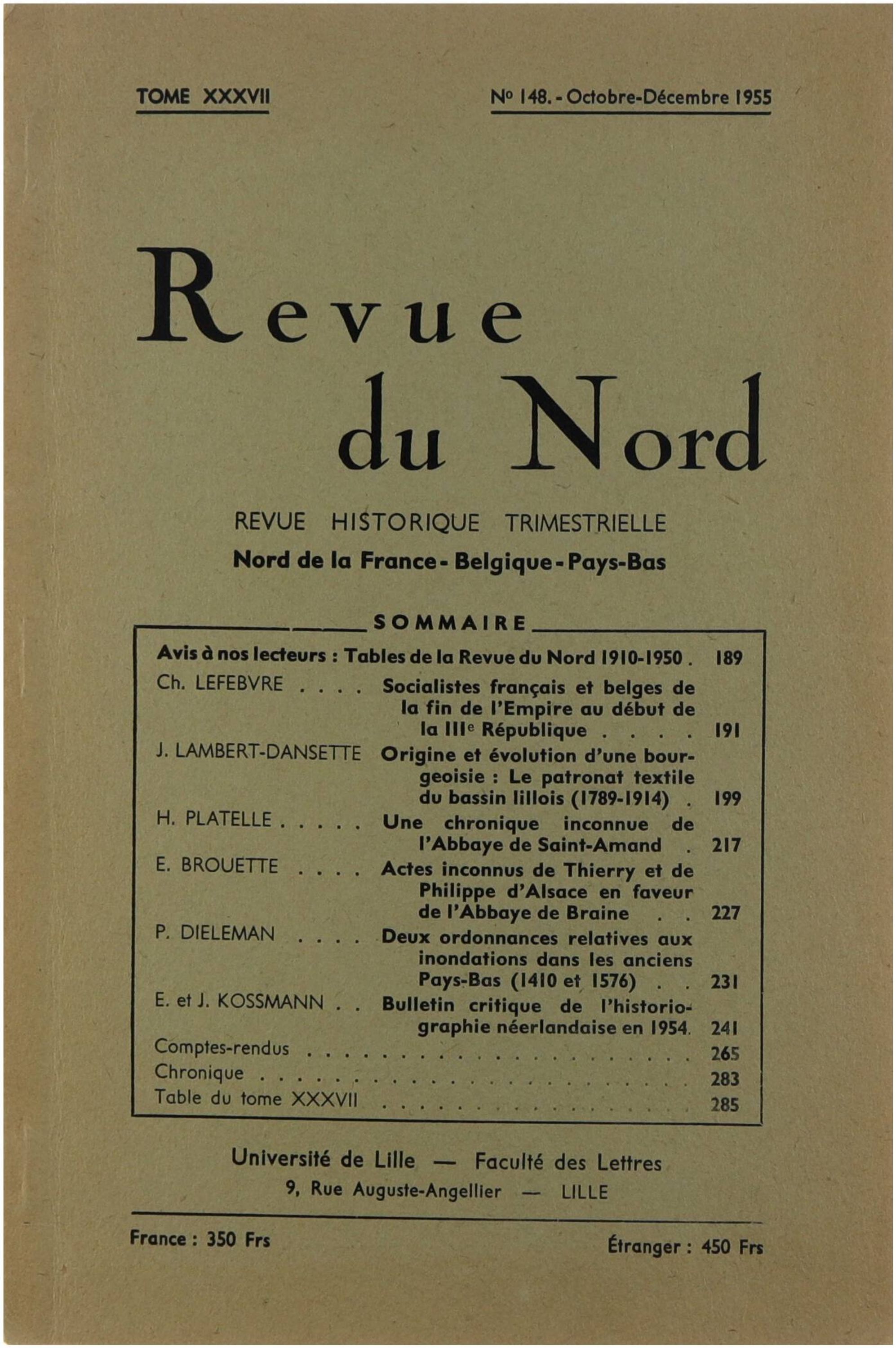 Revue du Nord. Revue historique trimestrielle Nord de la France-Belgique-Pays Bas (tome XXXVII N° 148)