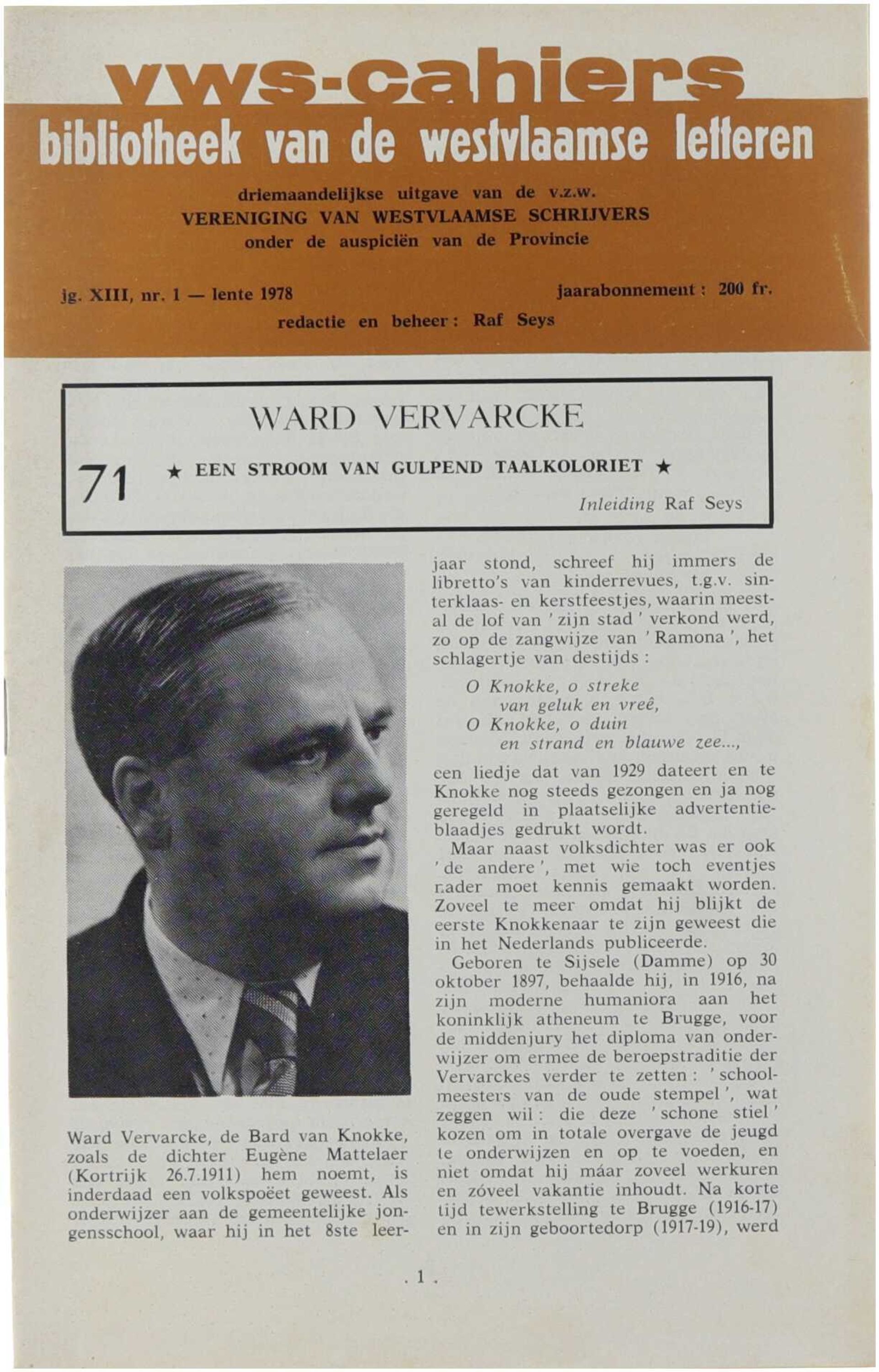 Dit cahier is gewijd aan het leven en het literaire oeuvre van een West-Vlaamse schrijver en biedt een biografisch en kritisch overzicht van diens betekenis binnen de regionale en Vlaamse literatuur. Aan de hand van levensgegevens, thematische bespreking en situering binnen de literaire context wordt het schrijverschap belicht, met aandacht voor stijl, thematiek en culturele achtergrond. De uitgave kadert binnen de doelstelling van de VWS-cahiers om het literaire erfgoed van West-Vlaanderen te documenteren en toegankelijk te maken.