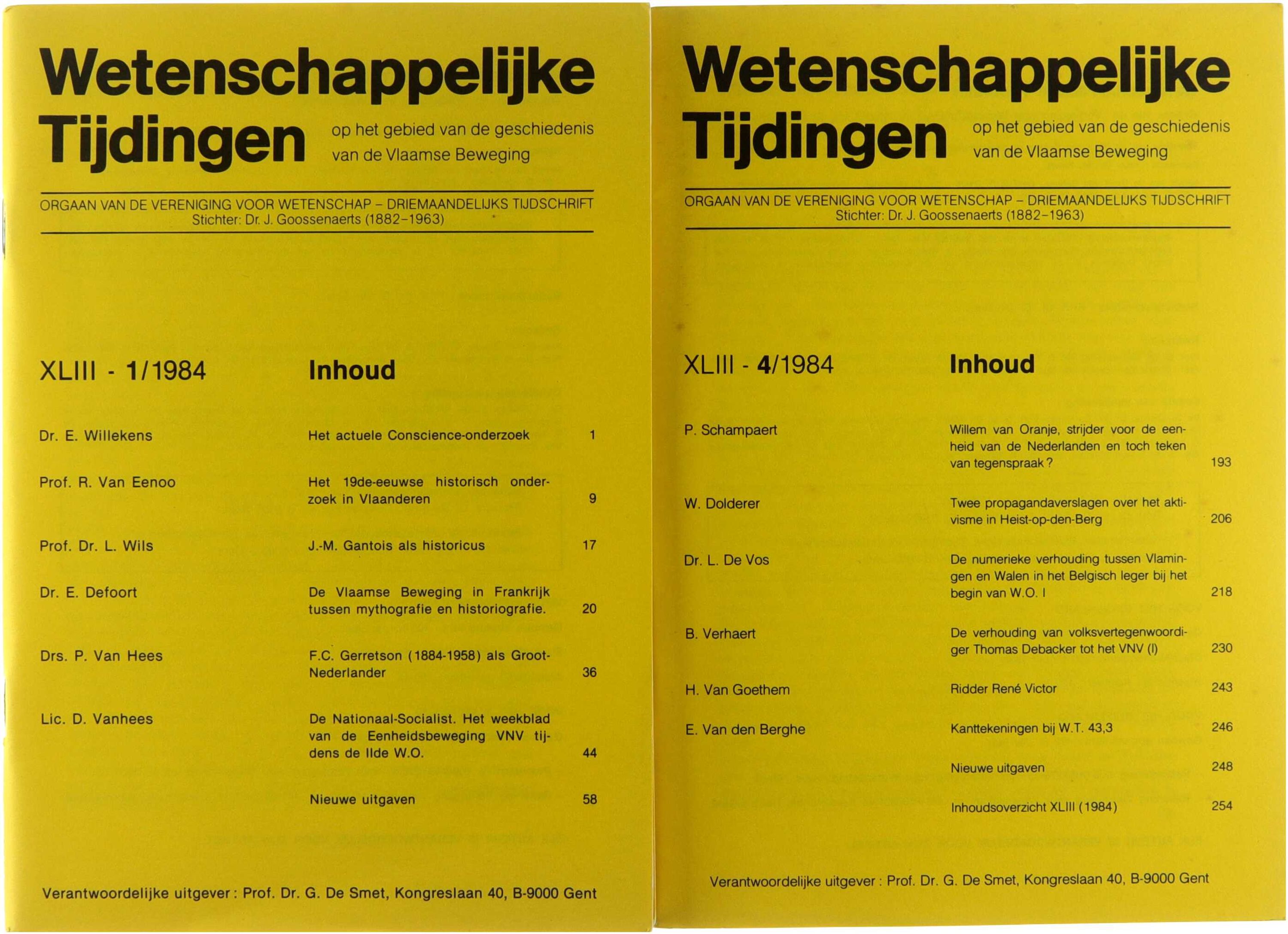 Wetenschappelijke Tijdingen op het gebied van de geschiedenis van de Vlaamse Beweging. Driemaandelijks tijdschrift. 1984 nrs 1 t.e.m. 4