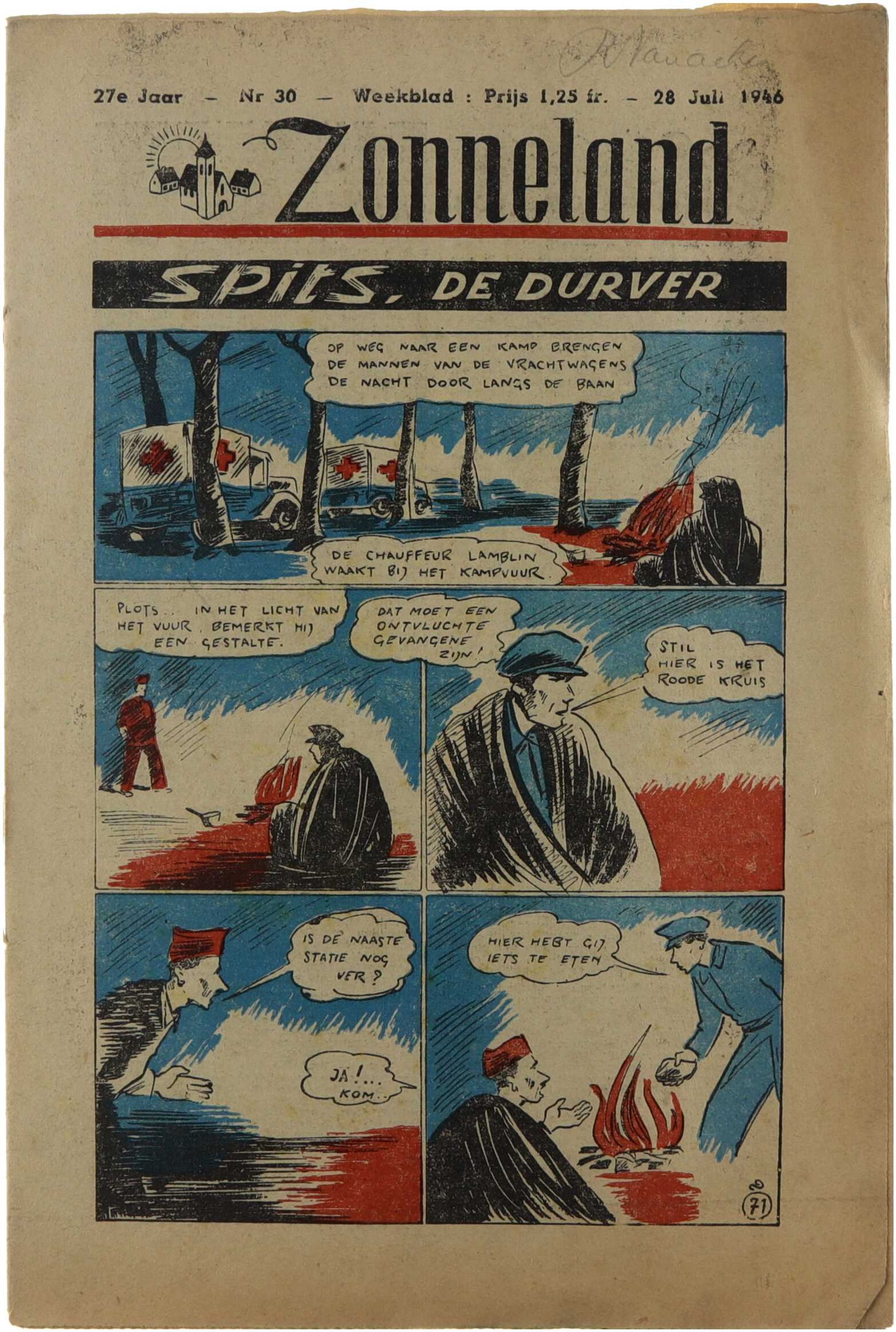 Zonneland was een wekelijks katholiek jeugdblad, uitgegeven door Goede Pers (Averbode), bestemd voor kinderen en jongeren die verbonden waren met de katholieke jeugdbeweging en de Eucharistische Kruistocht. De nummers uit 1946 verschenen in een periode van naoorlogse normalisering en boden een vaste mix van religieuze vorming, opvoedende en moraliserende teksten, verhalen, rubrieken voor ontspanning en bijdragen die gericht waren op geloofsbeleving, gemeenschapszin en persoonlijke ontwikkeling. Het tijdschrift speelde een belangrijke rol in de katholieke jeugdopvoeding en bevatte bijdragen van vaste medewerkers zoals Daniël De Kesel, beter bekend als Nonkel Fons