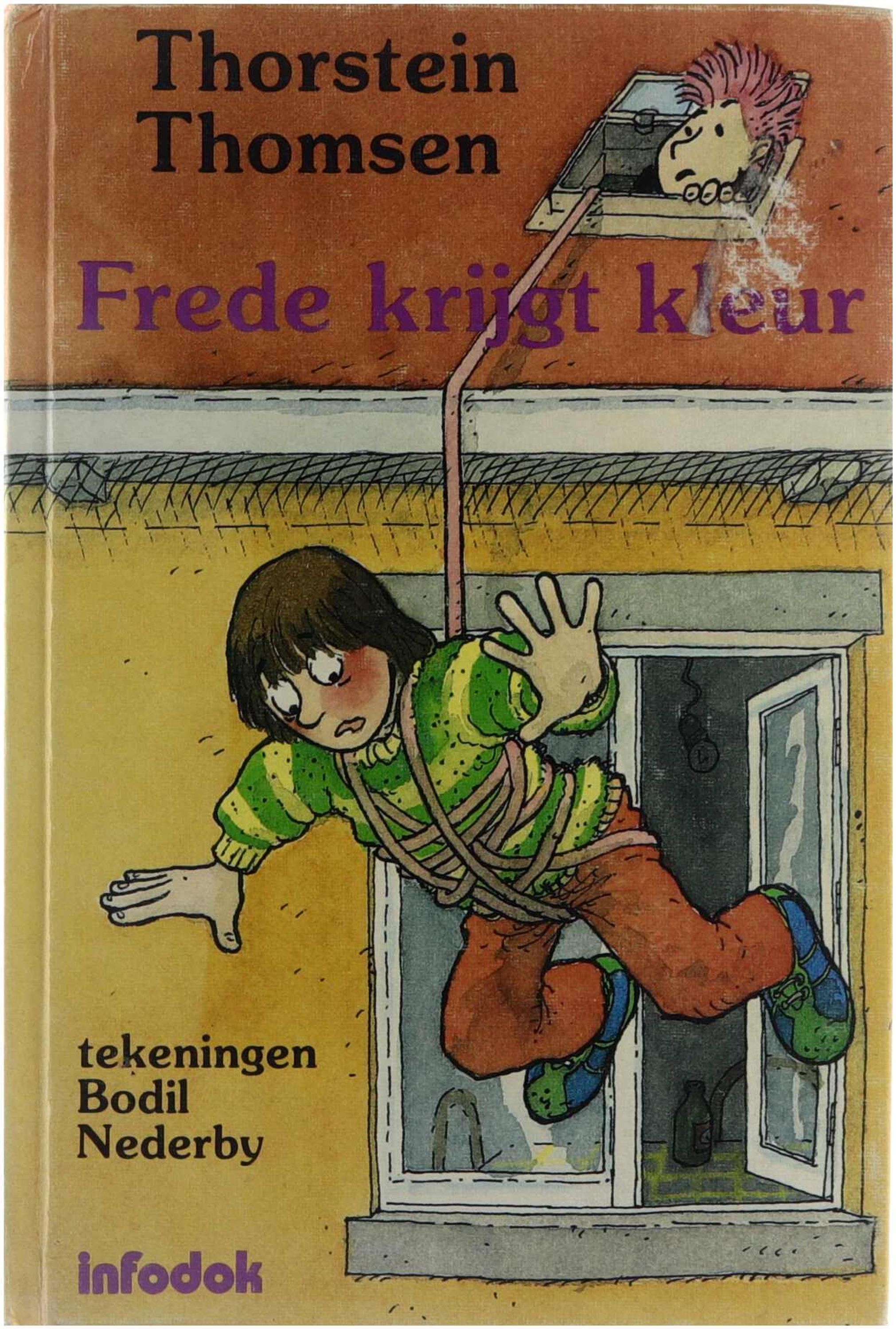 Kjeld roept weer: "Probeer het raam te pakken." Frede trekt zijn hoofd op. Voor zich ziet hij het raam. "Ik kan er niet bij komen," roept Frede. Het is net alsof hij Kjeld hoort vloeken. Dan wordt het stil... Betty en alle anderen uit "Frede doet zaken" zijn er opnieuw bij. Frede trekt veel op met de punker Kjeld. Kjeld is werkloos en heeft dus veel tijd om zich te storten op de Frede bezig te houden. En die twee weten altijd wel iets leuks te verzinnen. Thorstein Thomsen schreef dit tweede boek over Frede met een grenzeloze fantasie en veel humor. Hij is een bekend kinder- en jeugdboekenauteur, cabaretier en componist, en ontving verscheidene bekroningen in Denemarken. Vanaf 9 jaar. Een infodok kinderboek.