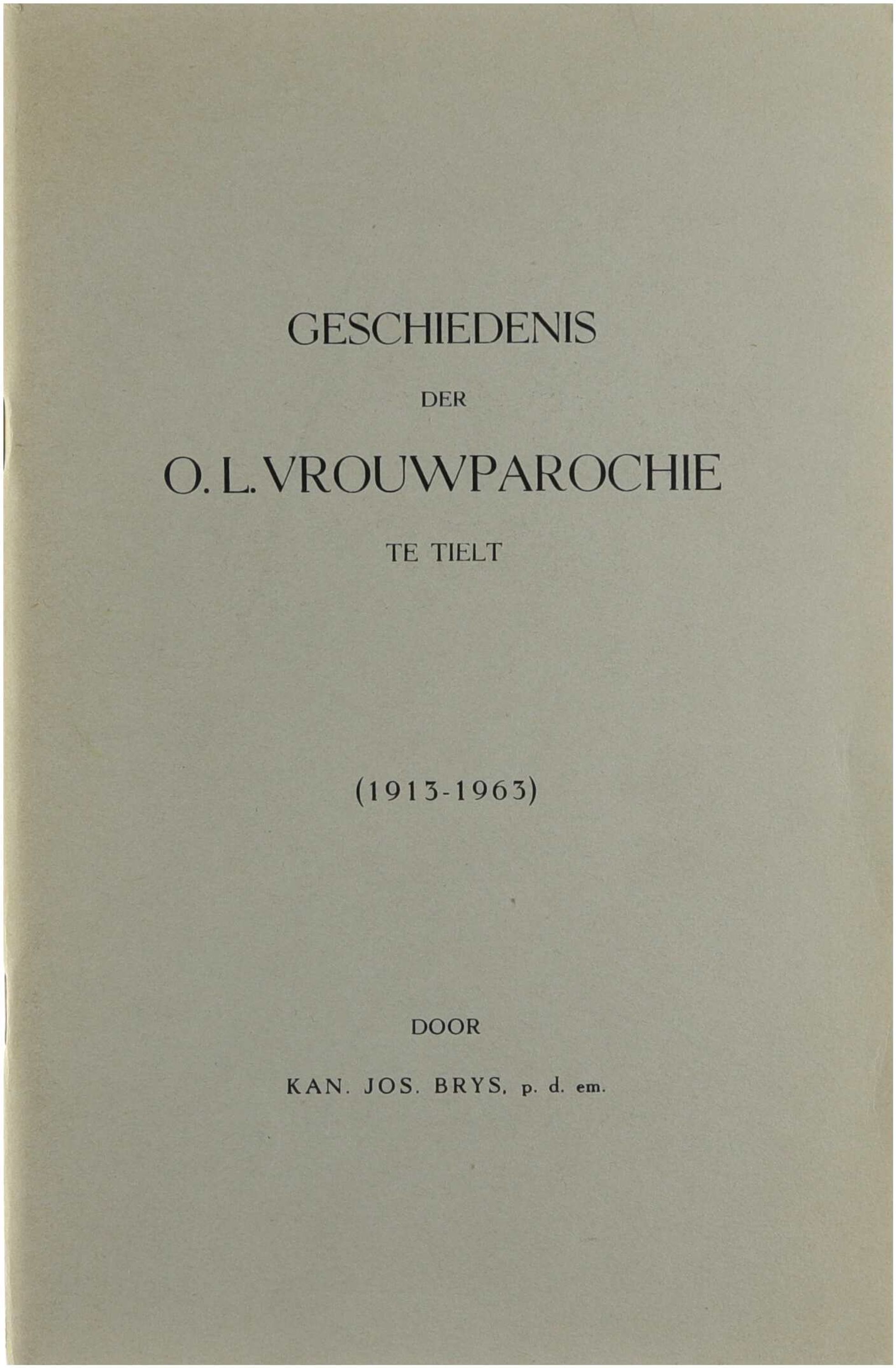 In Geschiedenis der O.L.Vrouwparochie te Tielt (1913-1963) beschrijft Jos. Brys de geschiedenis van de parochie van Onze-Lieve-Vrouw te Tielt in de periode van 1913 tot 1963. Hij behandelt de ontwikkeling van kerkelijke structuren, veranderingen in de parochiële gemeenschap, pastoors, kerkgebouwen en relevante gebeurtenissen binnen die vijftig jaar.