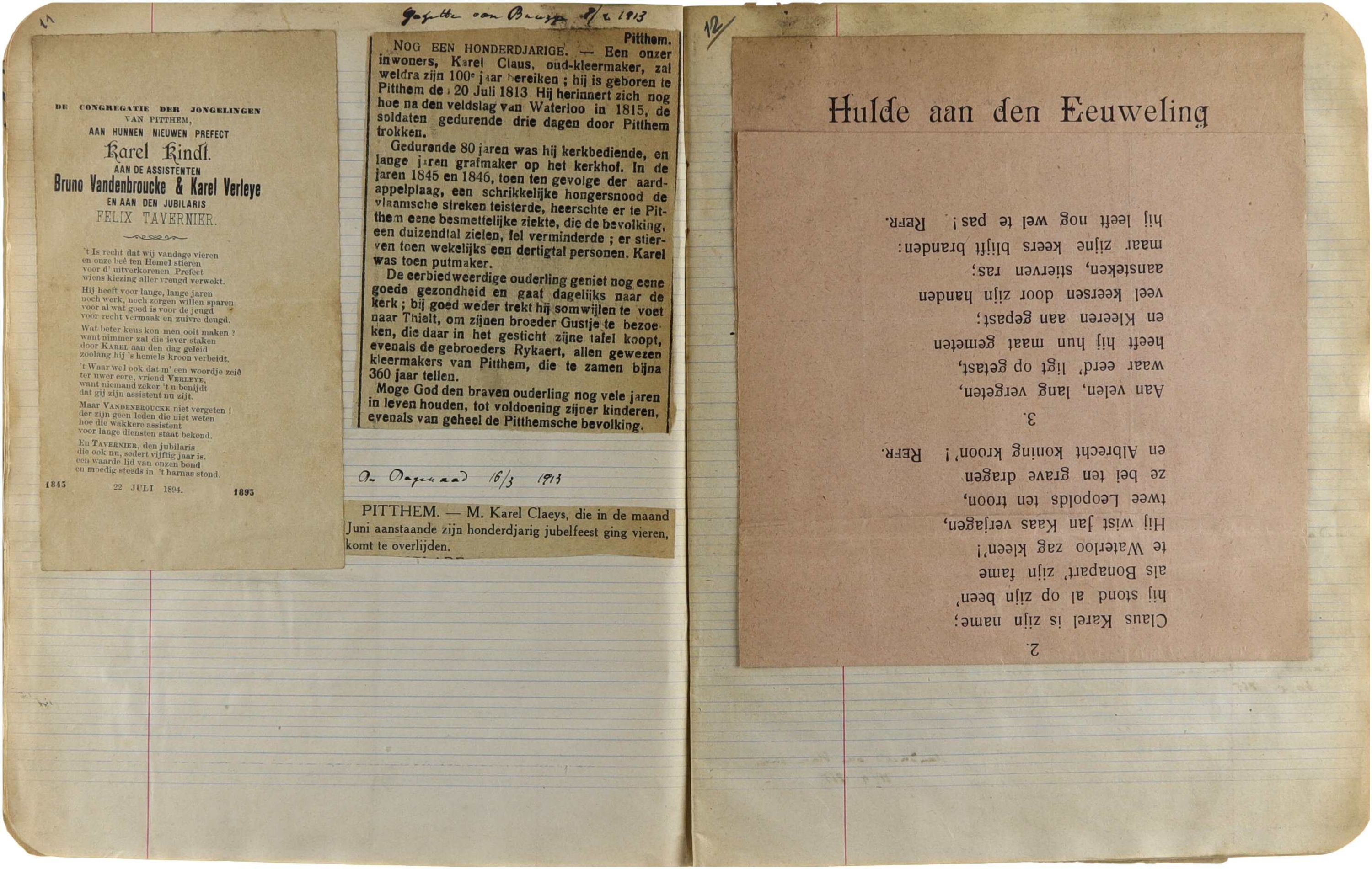 Uitnodigingen aanstellingen, etentjes, krantenartikelen, periode 1845-1913. K. Fonteyne, Henri Devroe, Holvoet, Lodewyk De Costere e.a. pastoors en nonnen. Documenten over Karel Kindt, Bruno Vandenbroucke, Karel Verleye, Karel Claus, runderpest, Verbiestfeesten. Ingeplakte gedachtenisprentjes van Marie Joseph, Carolus Van Raes, Petrus Leonardus Brulois, Karel Fonteyne, Benedikt Bernolet