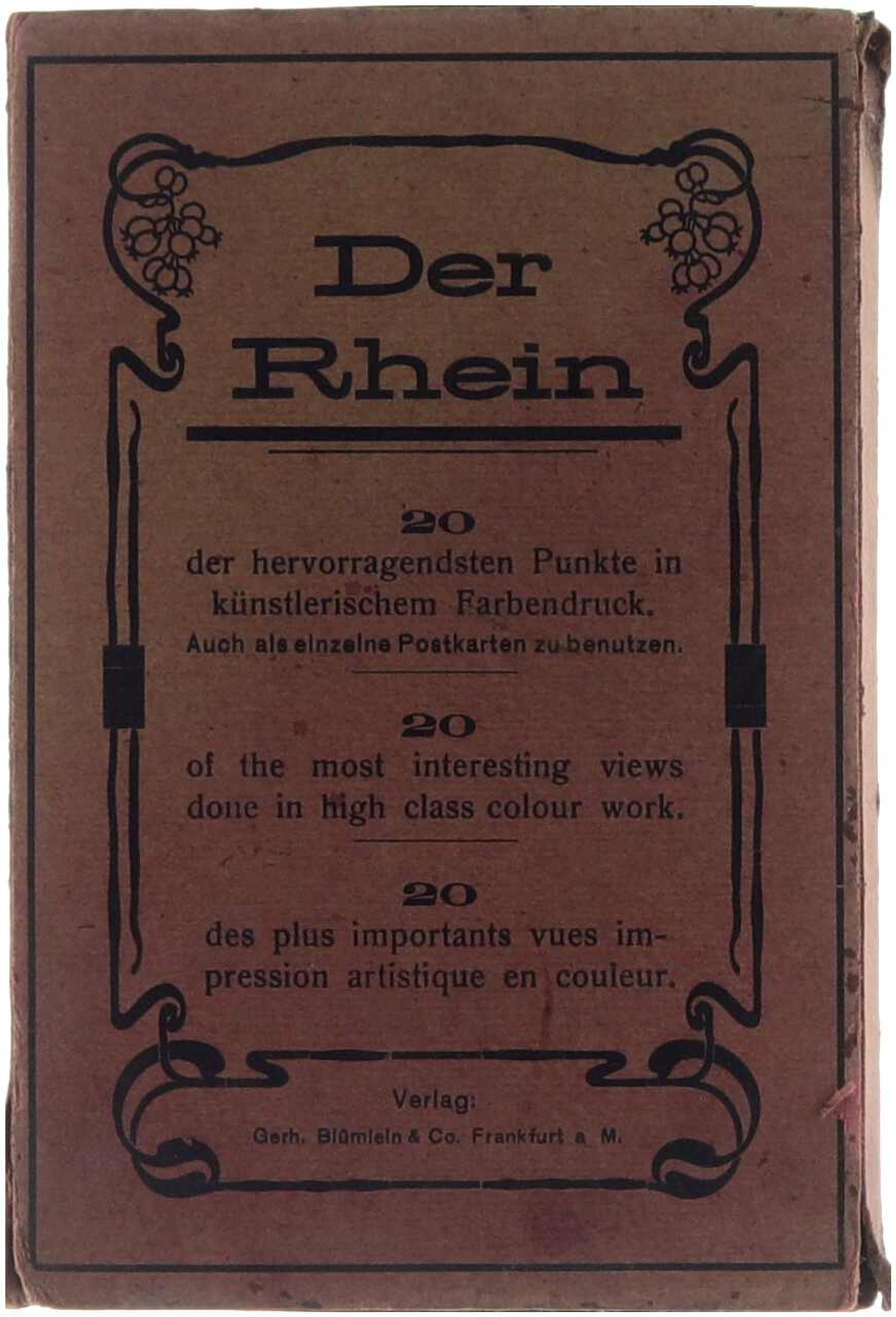 Diese Mappe enthält zwanzig farbige Künstlerkarten mit Ansichten der schönsten und bekanntesten Punkte entlang des Rheins, von der Quelle bis zur Mündung. Die im künstlerischen Farbendruck hergestellten Karten zeigen Landschaften, Städte, Burgen und Flusspanoramen und können auch einzeln als Postkarten verwendet werden. Herausgegeben von der Kunstanstalt Gerh. Blümlein & Co. in Frankfurt am Main ca. 1910