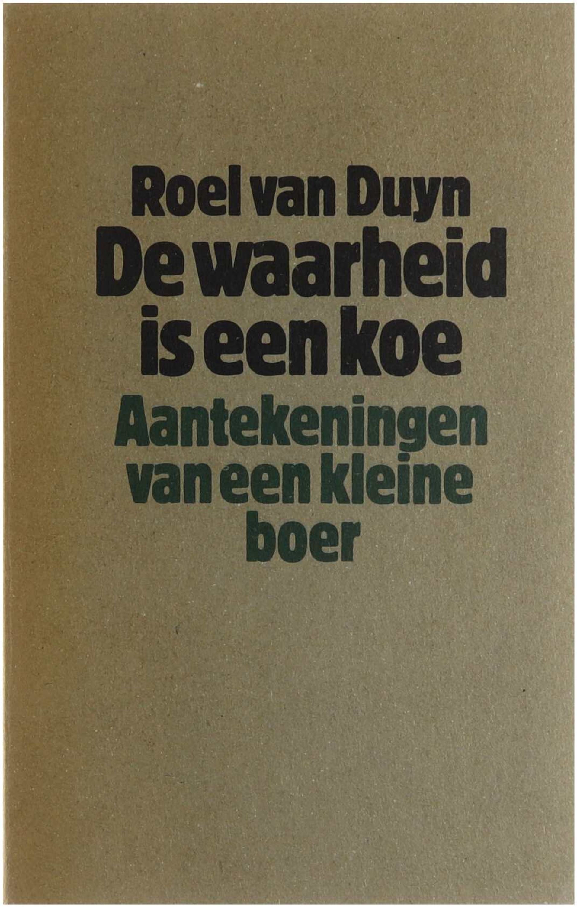 Na zijn (zoals onlangs bekend geworden is) tijdelijk afscheid van de politiek in 1976 vestigde Roel van Duyn en zijn vrouw José zich als ‘kleine boeren’ in Groningen; in hun ervaringen als boeren, van het alledaagse gesjouw in de moestuin en het leren melken van de koe tot de oprichting, vier en een half jaar later, van de coöperatie De Kleine Boer, is dit boek zowel verslag als pamflet: het verzet van een man tegen de oorlog die de Nederlandse landbouw voert met de natuur, tegen vergiftiging en uitbuiting van dieren en grond; Roel van Duyn pleit voor een kleinschalige en rechtvaardig geschoeide voedseleconomie, gebaseerd op oeroude relaties tussen mensen en dieren, mensen en planten en tussen dieren en planten onderling; Meulenhoff Amsterdam