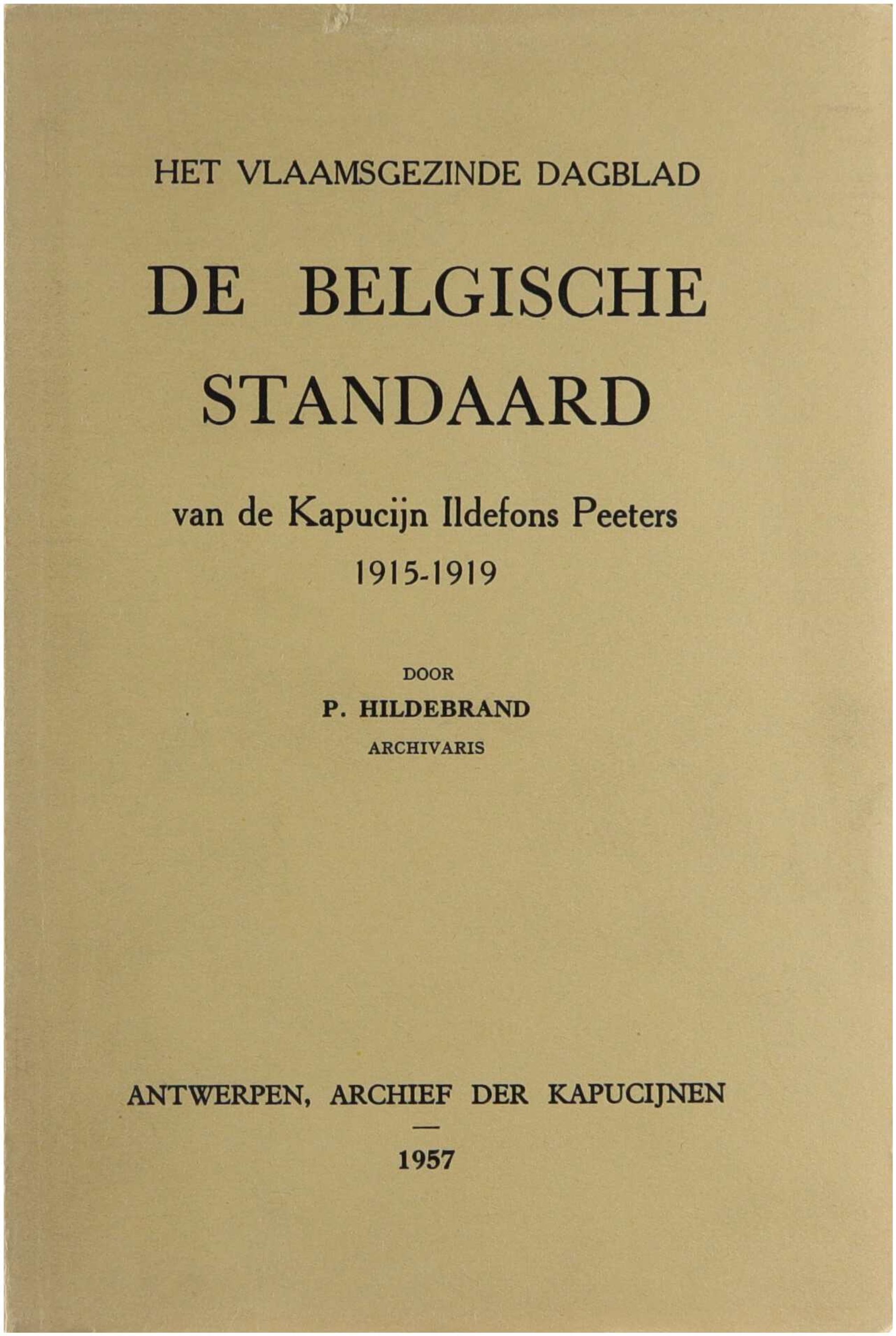 Dit werk analyseert het dagblad De Belgische Standaard (1915-1919), gesticht door de kapucijn Ildefons Peeters, vanuit het perspectief van de Vlaamse Beweging, het katholicisme en de oorlogsomstandigheden in de Eerste Wereldoorlog. De auteur, P. Hildebrand, geeft een chronologisch overzicht van de oprichting en werking van het blad, bespreekt redactieteam, medewerkers, verspreiding, censuur, activiteiten aan het front en het einde van het blad in 1919.