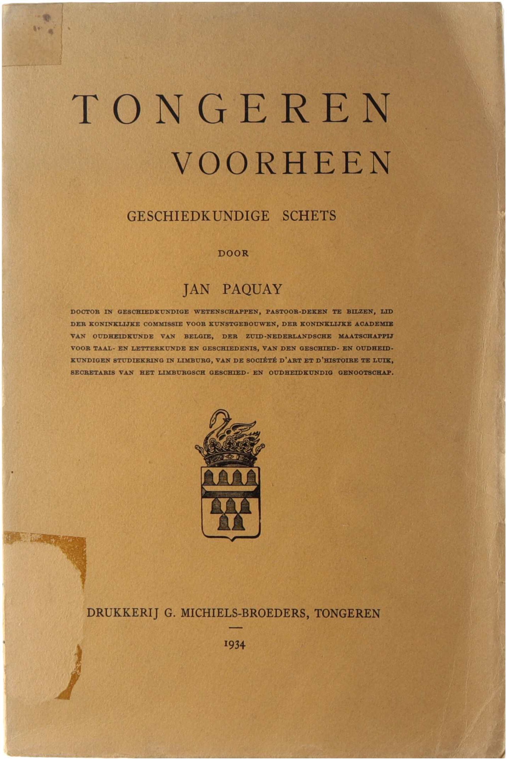 UIt het boek: In de beschouwingen die wij zullen geven over 't oud, Tongeren en zijne geschiedenis maken wij geen aanspraak, op originaliteit in overzichten of gevolgtrekkingen ; wij, willen enkel de gekende gegevens rangschikken, 't materiaal, dienstig voor verdere studie bijeenbrengen en zooveel mo-, gelijk ordenen., Wij zullen beurtelings handelen over :, I. - Het primitief Tongeren. Wording van stad en kerk ;, II. — Bibliographie en Topographie der opdelvingen. Verzamelingen van romeinsche oudheden ;, III. - De eerste kristenheid, kristene begraafplaatsen en, gedenkstukken ;, IV. - De eerste kerk ; bisdom en bisschoppenlijsten ;, V. - Het Munster en kapittelklooster ; O. L. Vrouw Basiliek,, en H. Schat ; overige kerken en kloosters ;, VI. - Magistraat en Schepenbank ;, VII. - Stadsverdediging en burgerwachten ;, VIII. - Ambachten, Rederijkerskamer, sociaal leven en, volksoptelling ;, IX. - Straten, huizen en uithangborden ;, X. - Verscheidene gebeurtenissen.