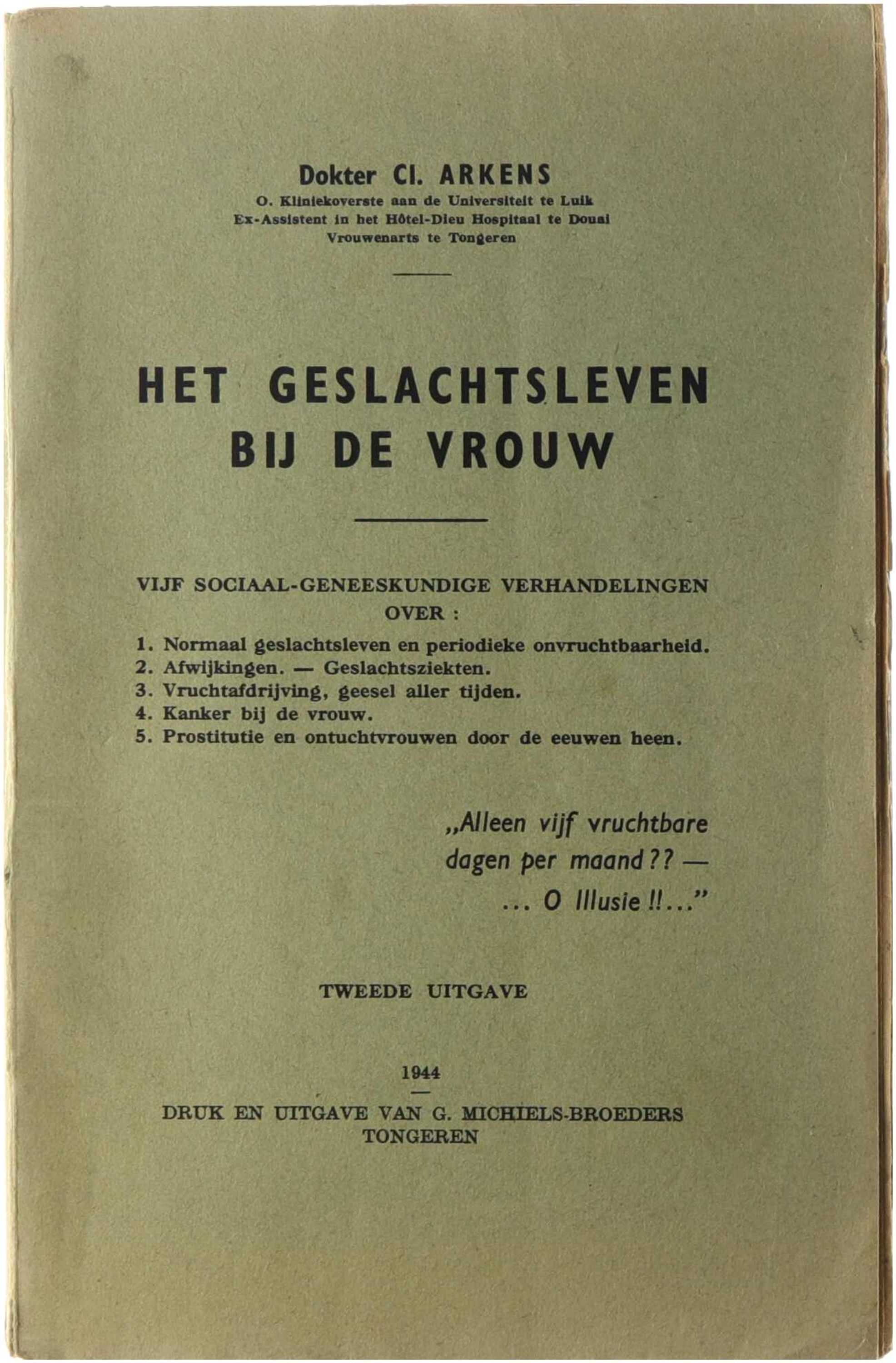 Het werk behandelt zes sociaal-geneeskundige verhandelingen over onderwerpen zoals normaal geslachtsleven, periodieke onvruchtbaarheid, afwijkingen, geslachtsziekten, vruchtafdrijving, kanker bij de vrouw en prostitutie